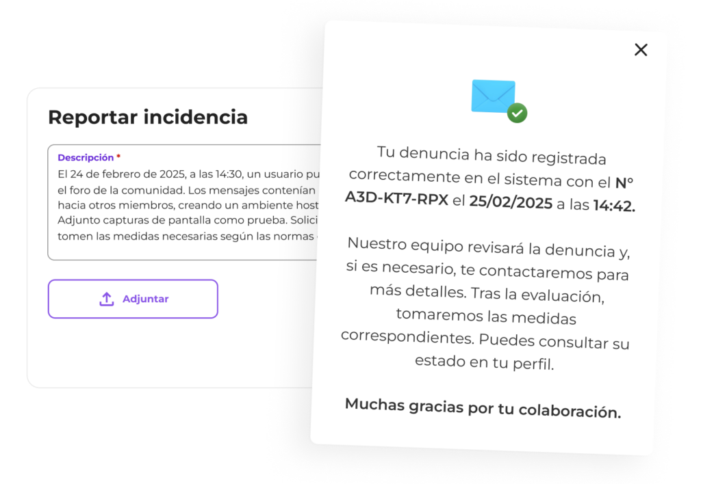 Garantiza un entorno seguro y transparente para tu equipo con un canal de denuncias que cumple con la Directiva Europea 2019/1937. Facilita la comunicación confidencial de irregularidades y protege a los denunciantes contra represalias.