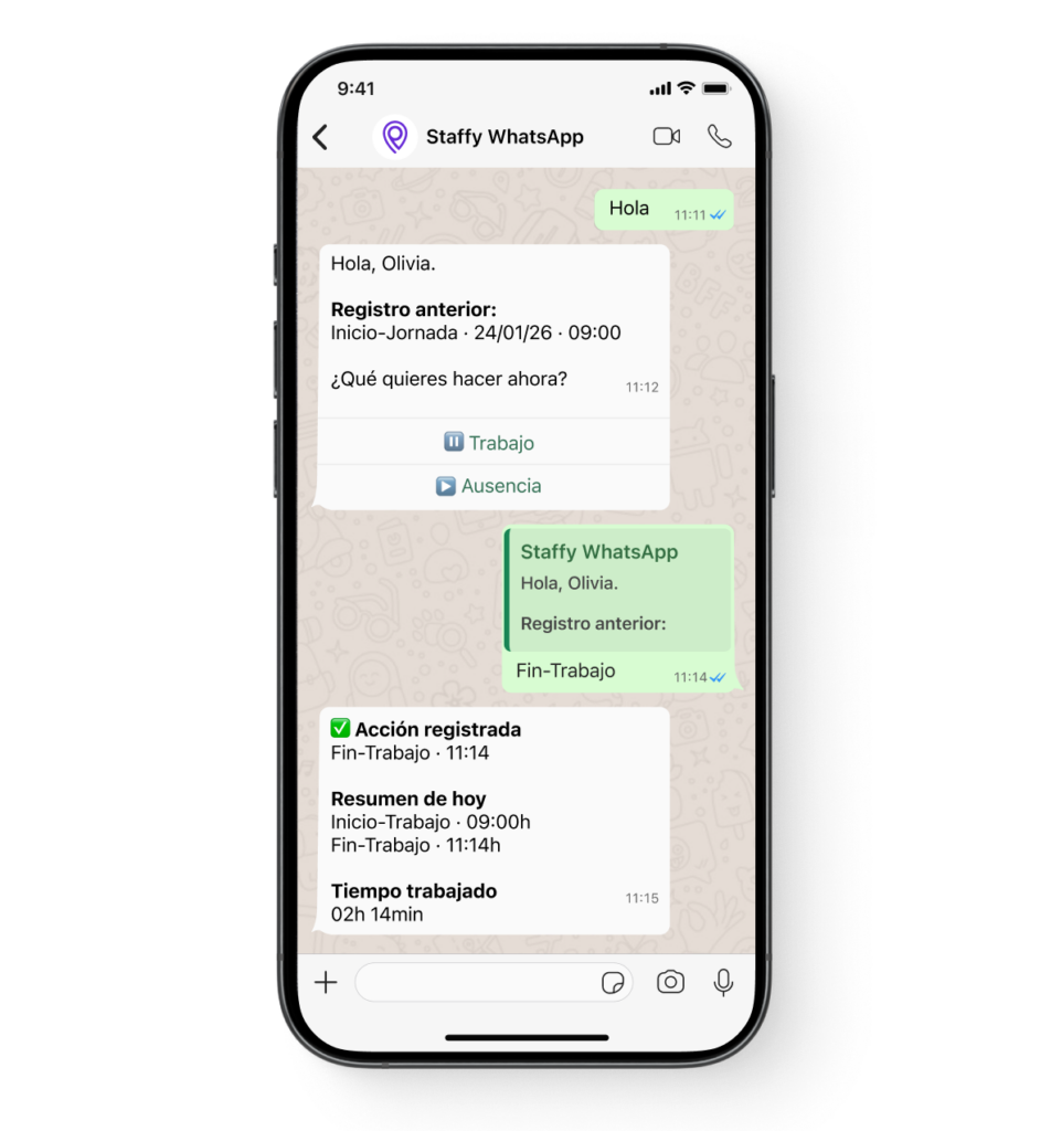 Permite a los empleados registrar su jornada laboral enviando un mensaje desde WhatsApp, sin necesidad de instalar aplicaciones ni acceder a la web. Una opción práctica para equipos en movilidad, operarios o perfiles sin acceso continuo a dispositivos corporativos.